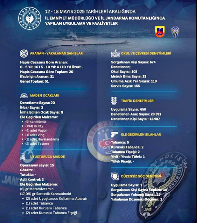 12 - 18 Mayıs 2025 tarihleri arasında, İl Emniyet Müdürlüğü ve İl Jandarma Komutanlığınca halkın güvenliği huzuru için yapılan uygulama ve faaliyetler şöyle;