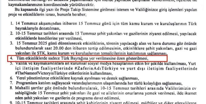 İçişleri Bakanlığı’nın 81 ilin valiliklerine gönderdiği genelgenin 4. maddesinde, “Tüm etkinliklerde sadece Türk bayrağının kullanılmasına özen gösterilmesi” ifadesi yer aldı. Bu maddenin amacıyla ilgili kamuoyunda oluşan tepkiler üzerine Bakanlık açıklama yaparak, “Amaç; düzenlenen etkinliklerde siyasi partilerin değil, sadece Türk Bayrağının kullanılmasını sağlamaktır” dedi.
