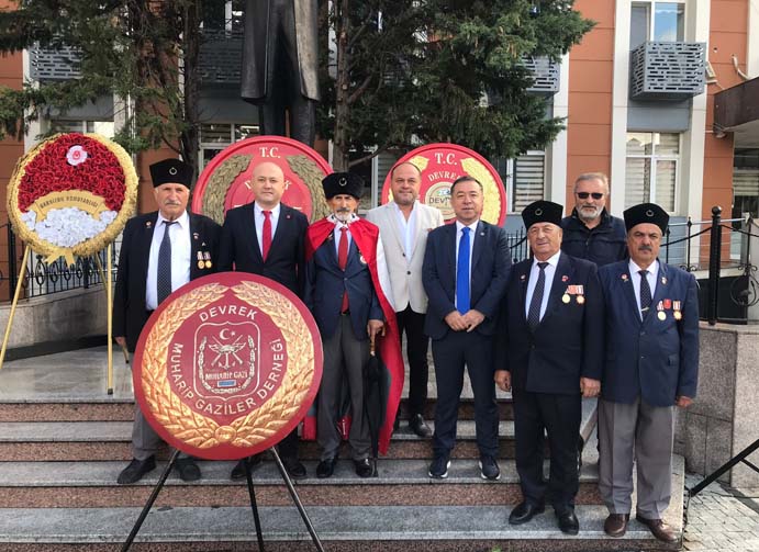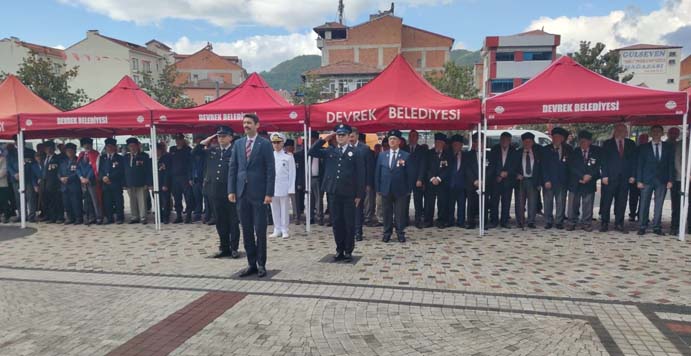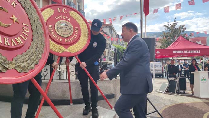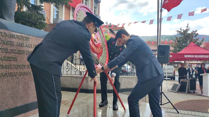 Cumhuriyet Alanındaki Atatürk Anıtı önünde yapılan tören, Devrek Kaymakamı Onur Alp Bıçakçı, Devrek Garnizon Komutanı Deniz Yarbay Hüsamettin Çalçoban, Devrek Belediye Başkanı Özcan Ulupınar, Türkiye Muharip Gaziler Derneği Devrek Şube Başkanı Muhterem Sarı’nın Atatürk Anıtına çelenkleri koymasıyla başladı.
