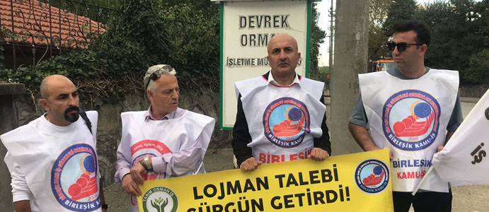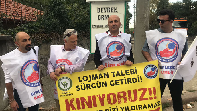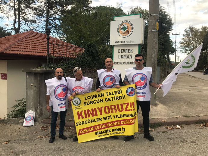Devrek Orman İşletme Müdürlüğü önünde yapılan basın açıklamasında, “Yargısız bir infaz nedeniyle Devrek’te bulunuyoruz. Şuan aramızda bulunan Özkan Çetin kardeşimizin, Devrek Orman İşletme Müdürlüğünden alınarak Karabük Ovacık Orman İşletmesi olayıdır. Bu olay yargısız bir infazdır. Nefret ve şiddetle kınıyoruz. Burada arkadaşımızın haksız ve gerekçesiz bir şekilde, ne olduğu belli olmayan, eften püften nedenlerle buradan alınıp Karabük’e sürgün edilmesi kabul edilecek durum değildir. Birleşik Kamu-İş olarak bu arkadaşımızın arkasındayız, yanındayız her türlü desteği de vereceğiz. Dediğimiz gibi susmayacağız, korkmayacağız ve biat da etmeyeceğiz. Biz kamu çalışanının hakkını savunmak için buradayız. Elbette amacımız kişilerin, haklarını sonuna kadar savunmaktır. Elbette arkadaşımız yalnız değildir, gerekçesi olarak ne hak ediliyorsa bunları biz adalete teslim edeceğiz. Kanuni haklarımızla beraber davamızı açacağız. Burada bir lojman sorunu vardır. Burada fazla mesaiden çalışmakla ilgili sorunlar vardır. Burada bir ayrım var, bir bölücülük var. Ve sendikalı olup olmayan, yandaş sendikaya peşkeş çekilme olayları var. 30 senedir burada lojmanda oturup hala daha lojmanı terk etmeyen çalışanlar var. Oysa lojman yönetmeliği der ki, 5 yıl oturduktan sonra diğer bir memur arkadaş buraya gelir. Kafa kol işaretleriyle beraber buradaki lojman yine yandaş sendikacılara, diğer kişilere peşkeş çekilecek, diğer arkadaşların hakları yenilecek. Biz, Tarım Orman İş olarak, Birleşik Kamu İş olarak, bu hukuksuzluğa artık el atma zamanı gelmiştir. Bu kardeşimiz burada bir çıban başı olarak görülse dahi asla ve asla yapılan sürgünün çok büyük bir hukuksuz olduğunu, yaptığı şikayetlerinin gerekirse çalışmalarının ve lojman sorununun, fazla mesaiden gelen haklarının alınması sonucu olarak bu kardeşimiz buradan maalesef sürgün edilmiştir. İşte bizde bu kardeşimizin haklarını sonuna kadar alacağız. Onun için Devrek Kaymakamlığına da, Orman İşletme Müdürlüğüne de, biz yaptıklarınızı, verdiğimiz dilekçelerin karşılığını almamız gerektiğini söyledik. Ama Devrek Kaymakamlığı da Orman İşletme Müdürlüğü de bu konuda uyuduğunu görüyoruz. Ama dediğimiz gibi biz kamu çalışanları olarak bir kişi dahi olsak hakkımızı istiyoruz. Başka bir derdimiz yok. Burada haksızlığa uğranan durum var. Bu haksızlığın giderilmesi lazım” ifadelerine yer verdi.