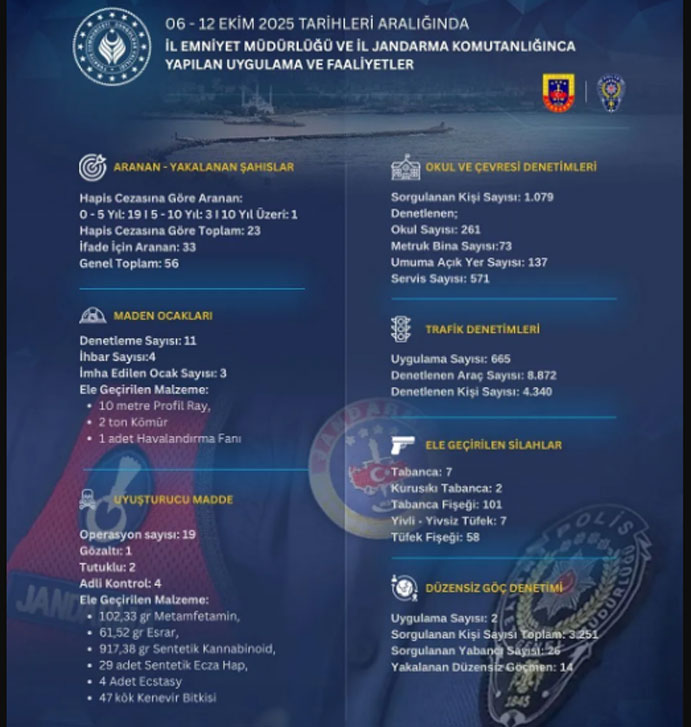 Okul güvenliği kapsamında bin 79 kişinin sorgulandığı denetimlerde 261 okul, 73 metruk bina, 137 umuma açık yer ve 571 servis aracı kontrol edildi. Trafik uygulamalarında ise 665 noktada 8 bin 872 araç ve 4 bin 340 kişi denetlendi.