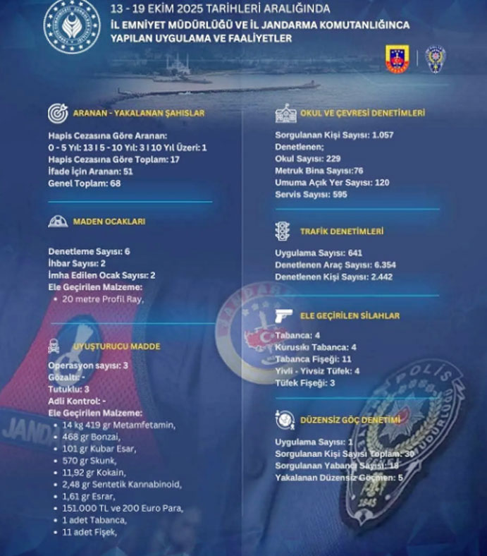 Zonguldak’ta, 13 - 19 Ekim 2025 tarihleri arasında, İl Emniyet Müdürlüğü ve İl Jandarma Komutanlığınca, vatandaşların huzur ve güvenliği için gerçekleştirilen uygulama ve faaliyetler paylaşıldı.