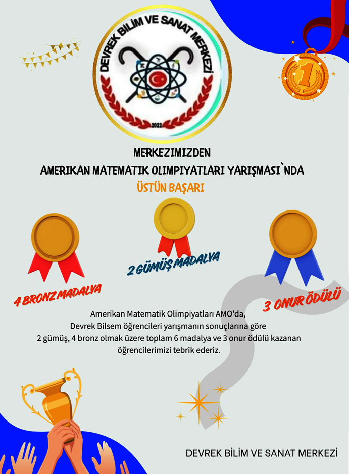 Devrek Bilim ve Sanat Merkezi öğrencileri, Amerikan Matematik Olimpiyatları(AMO)'nda, 2 gümüş, 4 bronz olmak üzere toplam 6 madalya ve 3 onur ödülü kazandı.