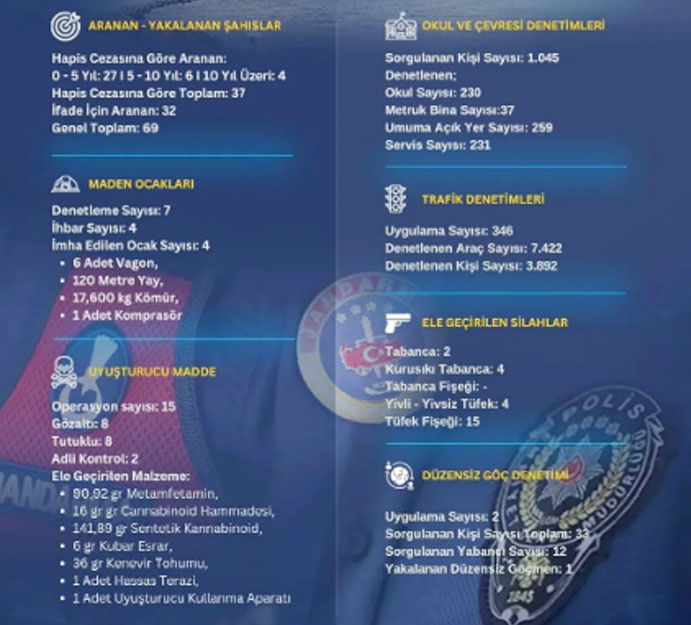 Zonguldak Valiliği’nce 5-11 Ocak 2026 tarihleri arasında polis ve jandarma ekipleri tarafından yapılan uygulama ve faaliyetlerin detayları sosyal medyada paylaşıldı. Zonguldak Valiliği tarafından paylaşılan bilgi notuna göre hapis cezası ve ifade için aranan 69 kişi yakalandı. Öte yandan denetlenen 7 maden ocağından 4’ü, imha edildi. Polis ve jandarma ekiplerinin yaptığı denetimlerin detayları şöyle: