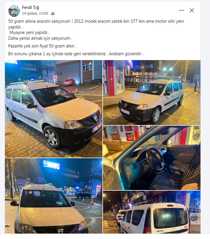 Daha yeni bir araç almak için arabasını sattılığa çıkardığını belirten Ferdi Tığ, araç satımında pazarlığın olmadığını son fiyatın 50 gram altın olduğunu sosyal medya üzerinden ilan vererek duyurdu.