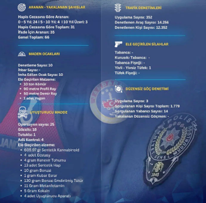 Zonguldak Valiliği, 3 Şubat - 1 Mart 2026 tarihleri arasında, İl Emniyet Müdürlüğü ve İl Jandarma Komutanlığınca yapılan uygulama ve faaliyetleri paylaştı.