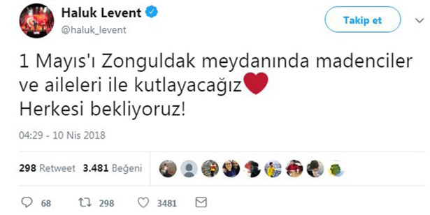 Türkiye’nin sevilen sanatçılarından ve madencinin daima yanında olan Haluk Levent, 1 Mayıs İşçi Bayramı’nda Zonguldak’a geleceğini sosyal medya hesabından duyurdu. Haluk Levent sosyal medya hesabında yaptığı paylaşımında “1 Mayıs’ı Zonguldak meydanında madenciler ve aileleri ile kutlayacağız herkesi bekliyoruz” dedi.