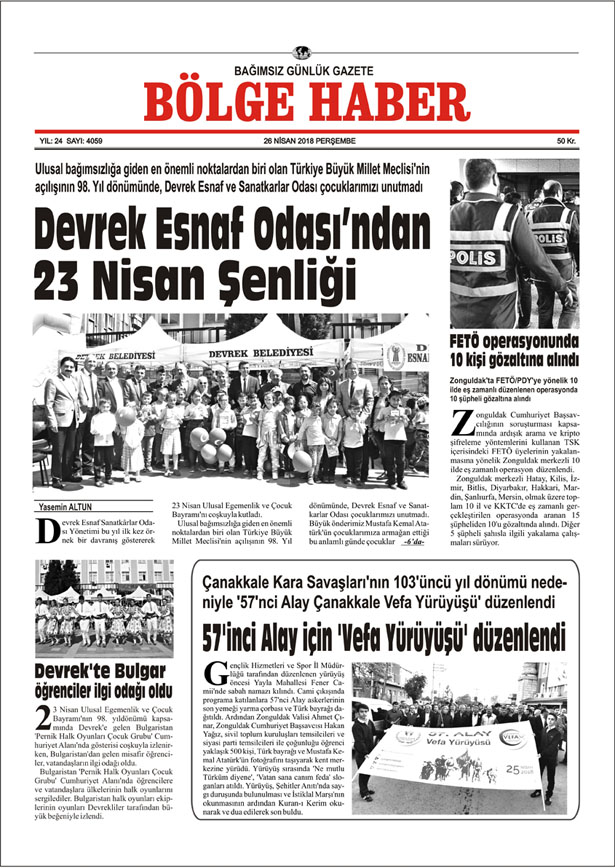 26 NİSAN 2018 BÖLGE HABER GAZETESİ SABAH BAYİLERDE..