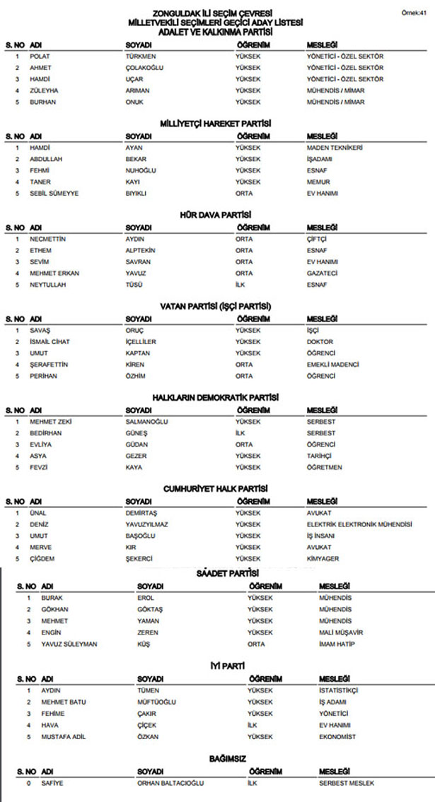 24 Haziran'da yapılacak Milletvekili Genel Seçimi'ne ilişkin geçici aday listesi açıklandı. Resmi Gazete'de yayımlanan Yüksek Seçim Kurulu (YSK) kararına göre, 8 siyasi parti tarafından Kurul Başkanlığına verilen aday listeleri incelendi. AK Parti, CHP, HDP, İyi Parti, MHP, Saadet Partisi, Vatan Partisi 87, Hür Dava Partisi 85 seçim çevresinde seçime katılacak. Zonguldak'ta kesinleşen liste ise şu şekilde: