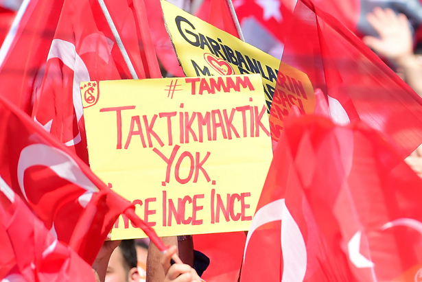 Hatay’dan Erdoğan’a seslensem, Erdoğan, meydan meydan geziyorsun ve diyorsun ki, 'Muharrem İnce sen çıraksın' diyorsun, bana 'çırak' diyor. Hatay’dan ona seslensem, benimle bir televizyon kanalına çık. Sizce çıkar mı? Çıksın mı? Gelecektir diye bekliyorum. Gözlerim yollarda kaldı usta, çakma usta! Cesaretin mi yok? Bilgin mi yok? Gel karşıma gel. Karşıma gel. Ben sana demedim mi her kuşun eti yenmez diye… Ben sana dedim.