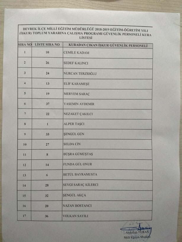 Kura sonucu kazananlara İdarece bilgi verilecek olup, sonuçlar ayrıca İl Milli Eğitim Müdürlüğü ile Bağlı İlçe Milli Eğitim Müdürlüklerinde ve Çalışma İş Kurumu Müdürlüğü ilan panolarında ilanen duyuruldu. Devrek İlçe Milli Eğitim Müdürlüğü İlan panosuna asılan liste ise şu şekilde;