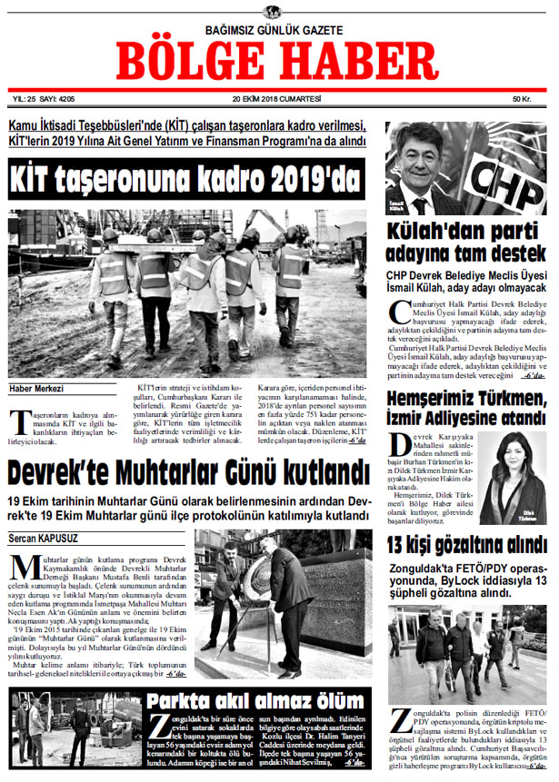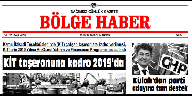 20 EKİM CUMARTESİ 2018 BÖLGE HABER GAZETESİ... SABAH BAYİLERDE....