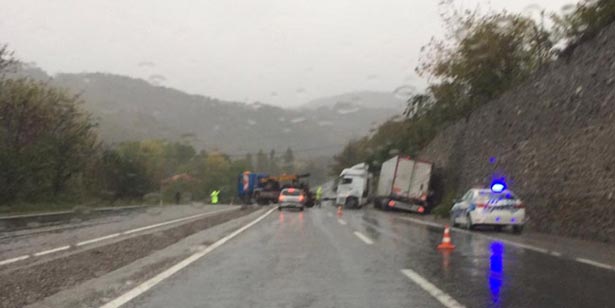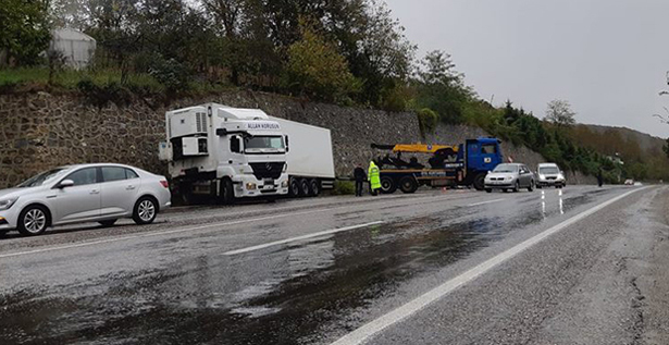 Devrek-Zonguldak karayolunun Karaman mevkiinde kayganlaşan yolda TIR yan yattı.