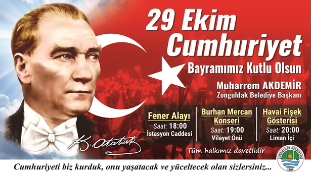 Zonguldak Belediye Başkanı Muharrem Akdemir, 29 Ekim Cumhuriyet Bayramı nedeniyle yazılı bir açıklama yaptı. Belediye Başkanı Muharrem Akdemir Cumhuriyet’imizin kuruluşunun 95’inci yıldönümünü kutlayarak yazılı açıklamasında şu görüşlerine yer verdi: “Ulu Önder Gazi Mustafa Kemal Atatürk’ün önderliğinde, milletimizden alınan güçle kurulan, çağdaş Türkiye Cumhuriyet’in 95’inci kuruluş yıldönümünü tüm yurtta olduğu gibi bizlerde büyük bir coşku içerisinde kutluyoruz. Türkiye Cumhuriyeti'nin kurucusu Mustafa Kemal Atatürk, Cumhuriyet’in Onuncu yılı kutlamalarının yapıldığı 29 Ekim 1933 tarihinde verdiği 10. Yıl Nutku'nda, bu günü en büyük bayram olarak nitelendirmiştir.