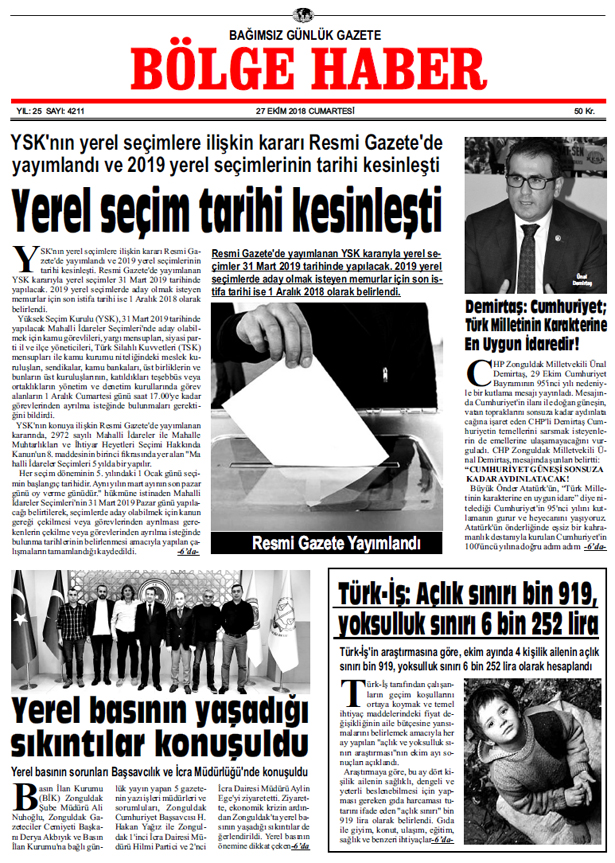 27 EKİM CUMARTESİ 2018 BÖLGE HABER GAZETESİ... SABAH BAYİLERDE....