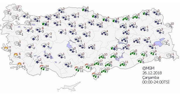 Ancak asıl kütle 2018’in ilk saatlerinde geliyor. Kar yağışı bu defa denizden gelecek ve özellikle kıyılarda etkili olacak. Üç gün etkili olması beklenen kar yağışı Ocak ayının ikinci haftası başında yeniden etkili olacak. Aralıklarla ikişer- üçer gün devam etmesi beklenen kar yağışı nedeniyle hava sıcaklıklarının geceleri eksi 7-8’e çıkabileceği belirtiliyor.