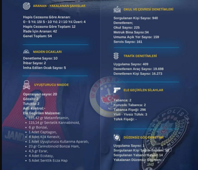 Zonguldak Valiliği 23 - 29 Mart 2026 tarihleri arasında, İl Emniyet Müdürlüğü ve İl Jandarma Komutanlığınca yapılan uygulama ve faaliyetleri paylaştı.